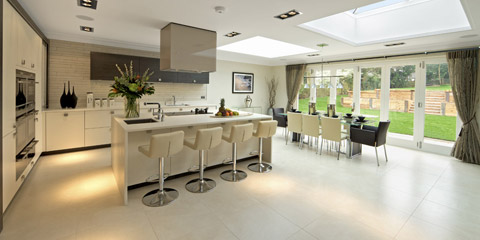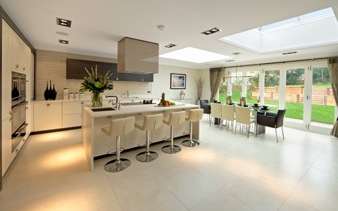 The client was looking to provide a very large open plan family kitchen to a new estate house in Lutterworth. We opened up the whole of the back of the original house and extended it the full width by 4m deep under Permitted Development. The extension had a flat roof so that large roof lanterns could be used and the rear wall had large bi-fold doors. The new room provides the family with a fantastic multi functional space that is filled with light.